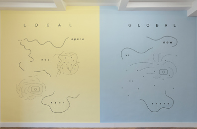 Os três diagramas e os módulos de escuta contribuem para a visualização e espacialização da fala do artista – enquanto obra – no local da exposição.