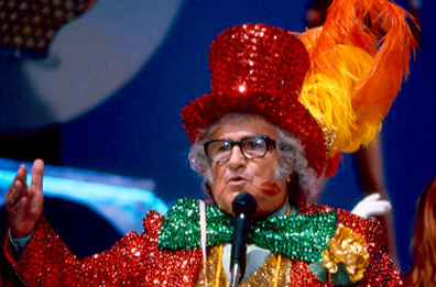 Fotografia: Stephan Nercessian caracterizado como Chacrinha e cercado pelas chacretes (Crédito: Robert Schwenck)